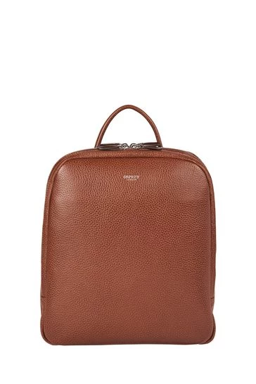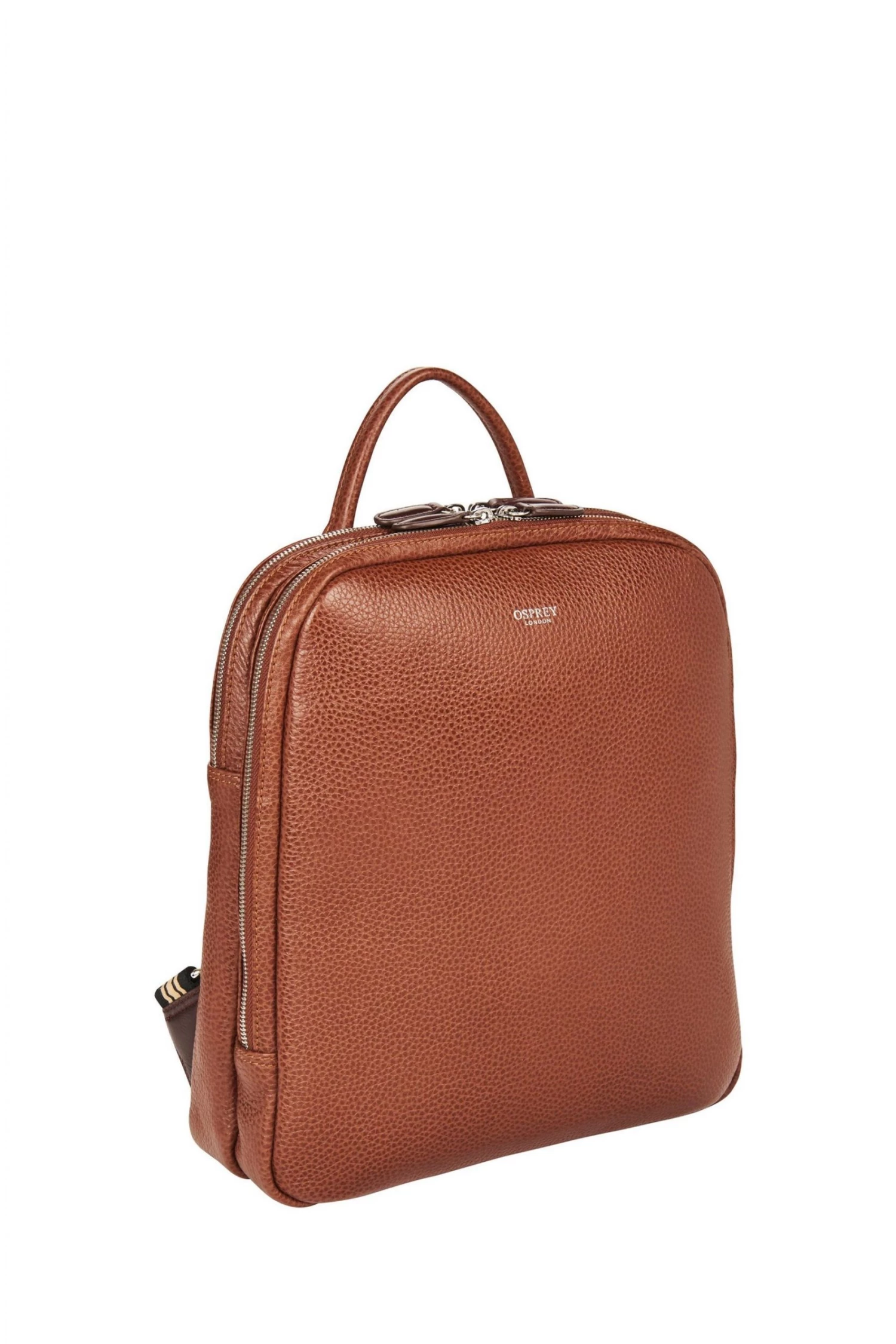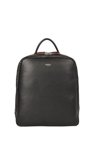 OSPREY LONDON slimline backpack handcrafted in smart Grainy Hide leather. Wear the backpack over the shoulders with the two adjustable flat woven stripy straps in shades of buff and black, which are sewn into the bag at the top. The spacious A4-compatible interior can hold up to a 13 inch laptop and is lined in smart black jacquard fabric with the gusseted front section featuring one large slip pocket, a small slip pocket to store smaller items and four card slots. The back section features a large zip pocket, framed in matching leather, with a chocolate brown leather zip-pull. Below the zipped pocket sits the embroidered OSPREY LONDON winged crest logo also framed in matching leather.