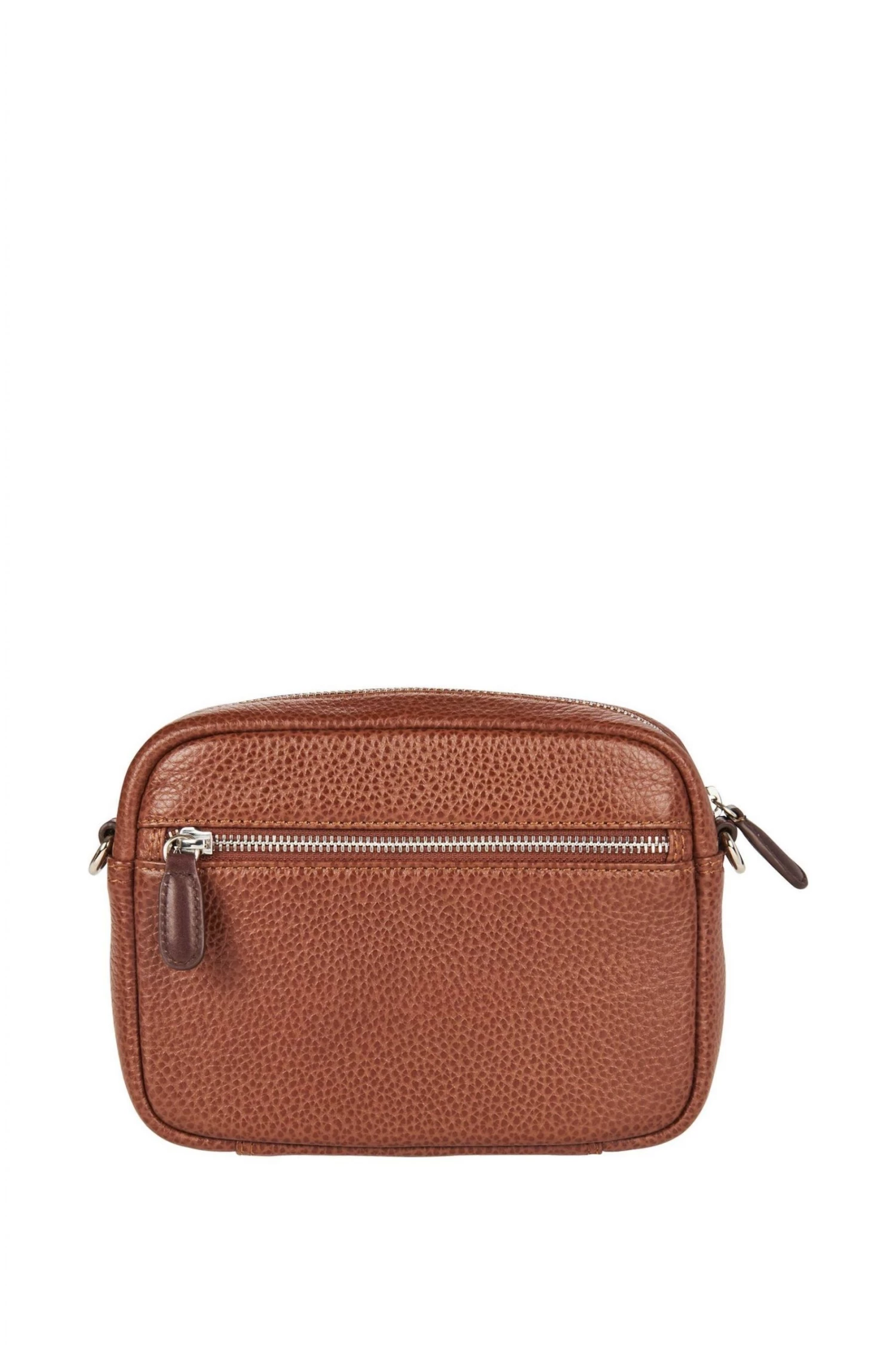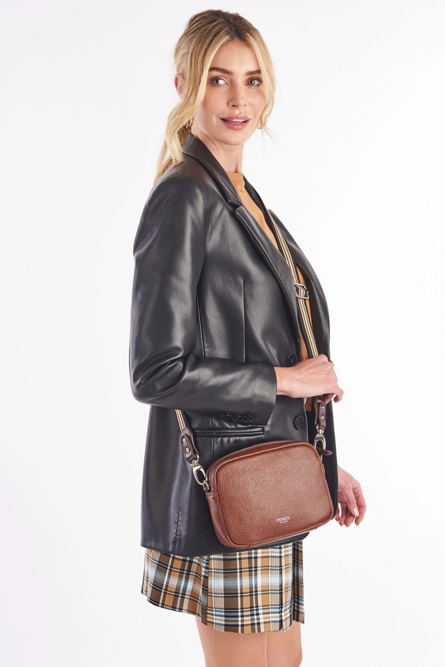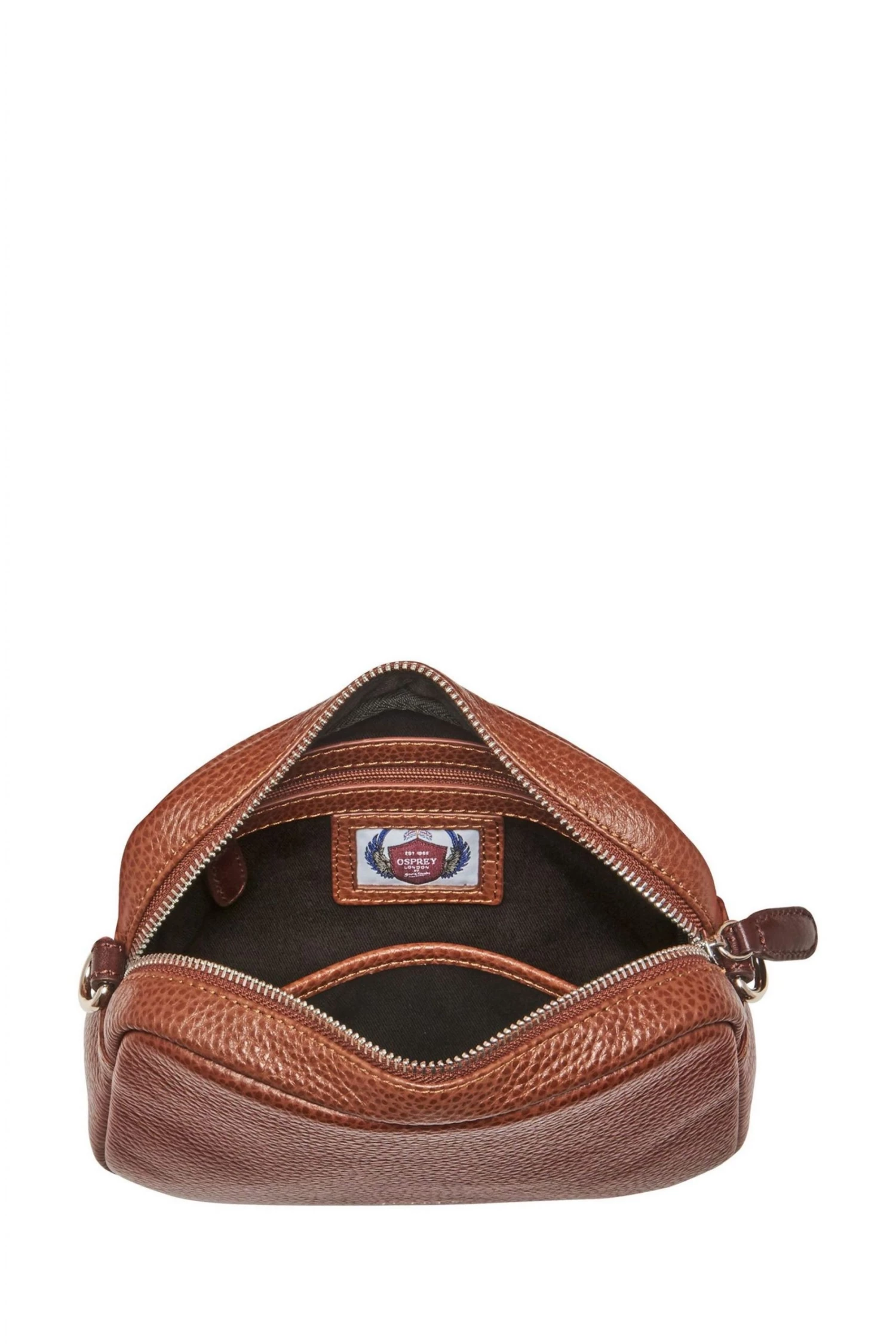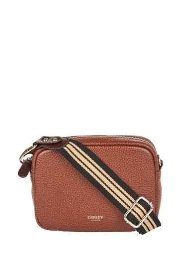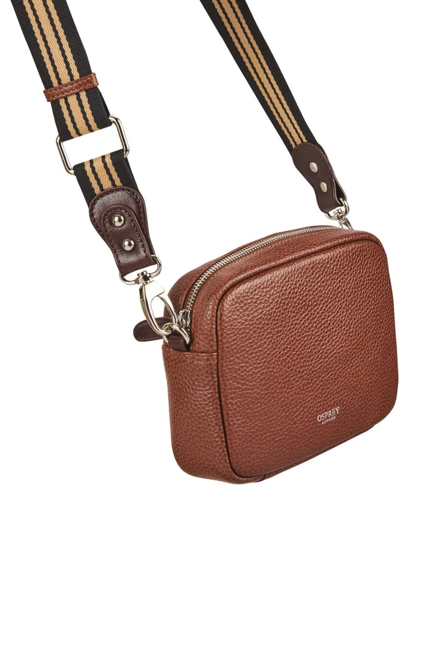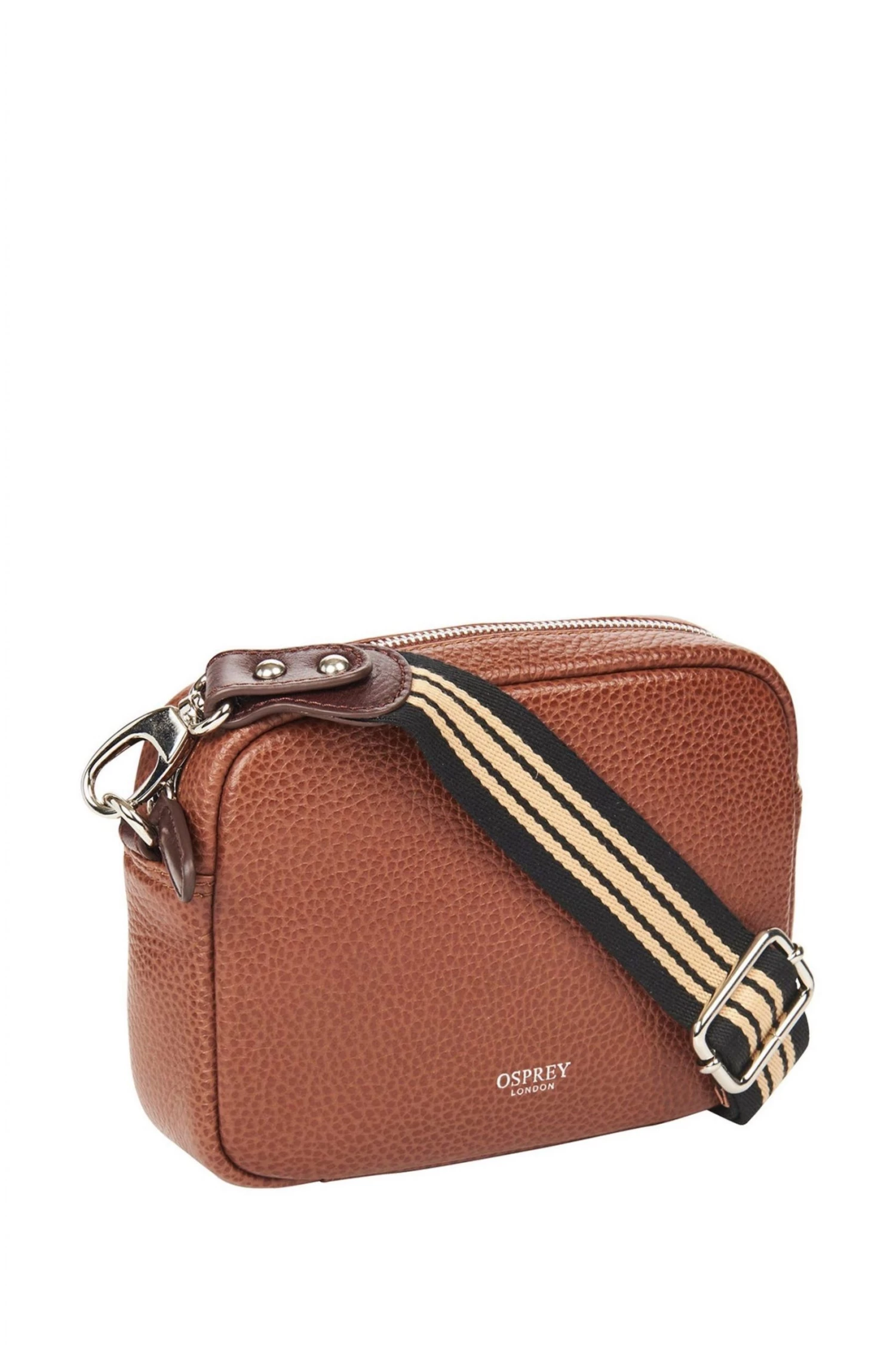 OSPREY LONDON neat cross-body bag, handcrafted in smart Grainy Hide leather with smart self-coloured stitching, hand-applied edge colour and silver metal hardware throughout. Convertible design: carry as a clutch or wear across the body or on the shoulder with the woven stripy strap in shades of buff and black with chocolate brown leather tabs. The strap is fully adjustable and features two silver metal lobster claw clasps which fix onto the two silver metal D-rings on each side of the bag.