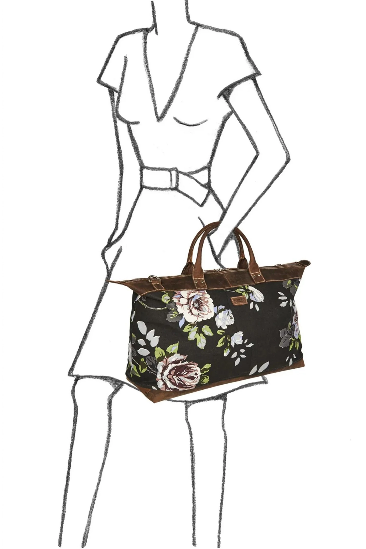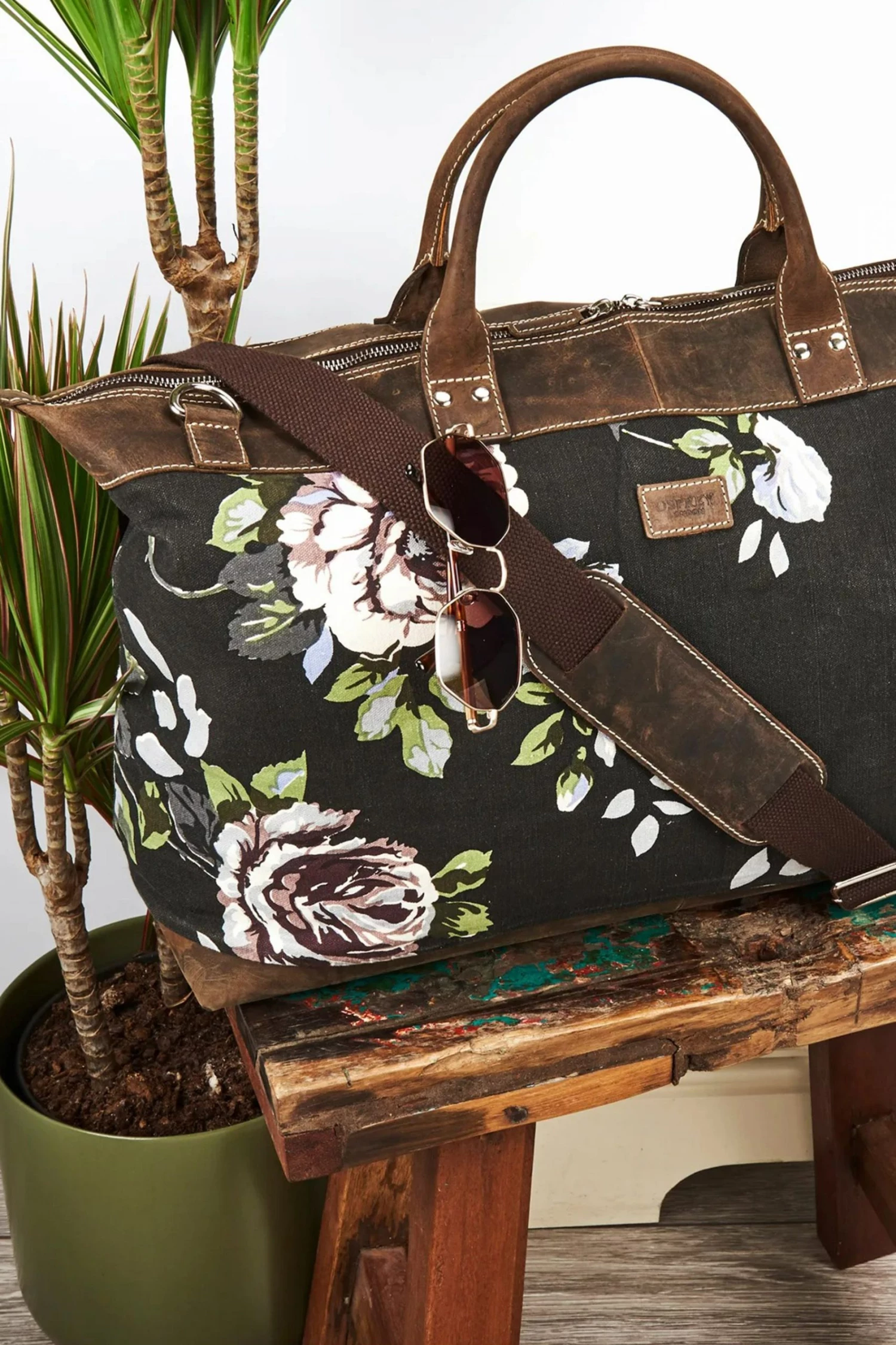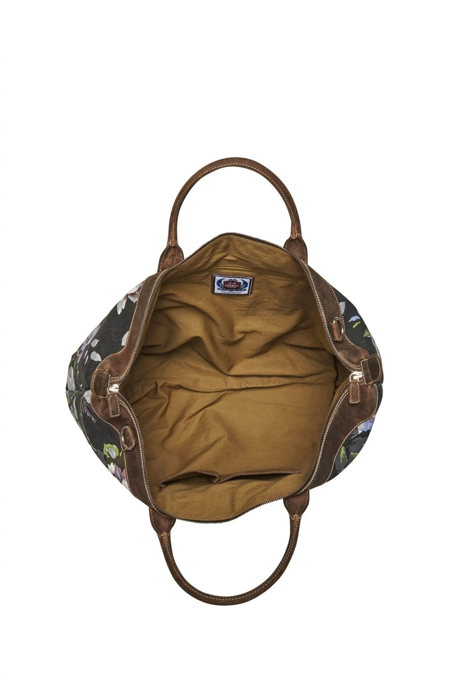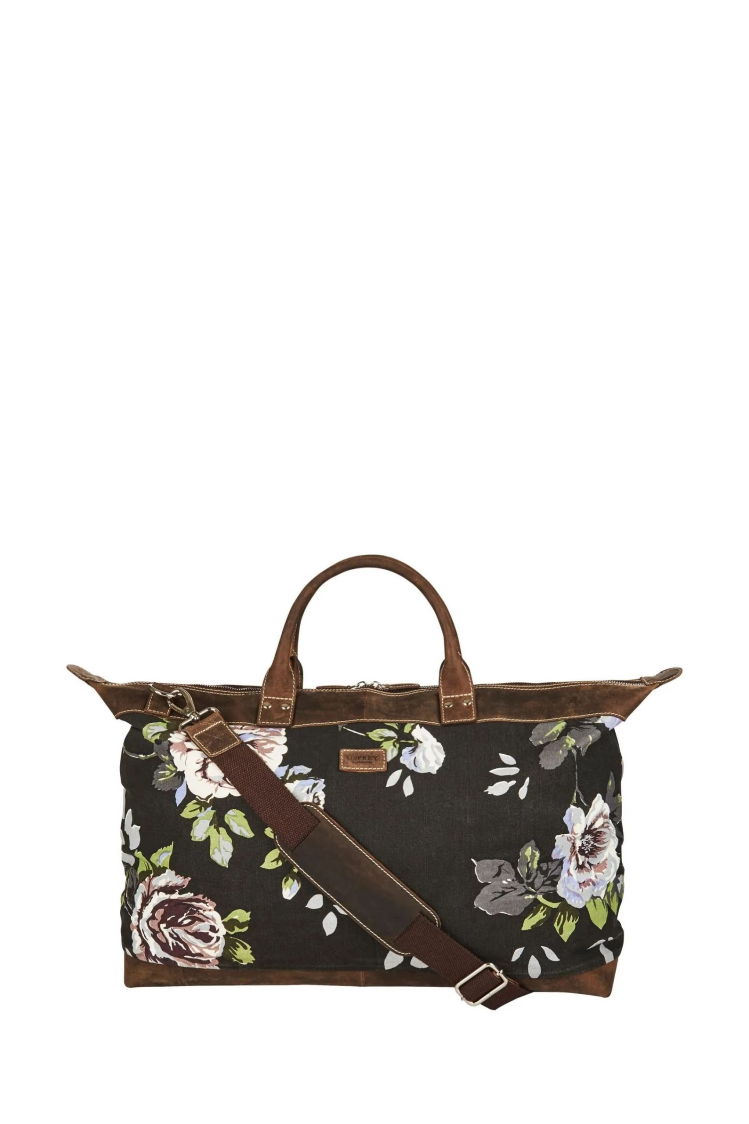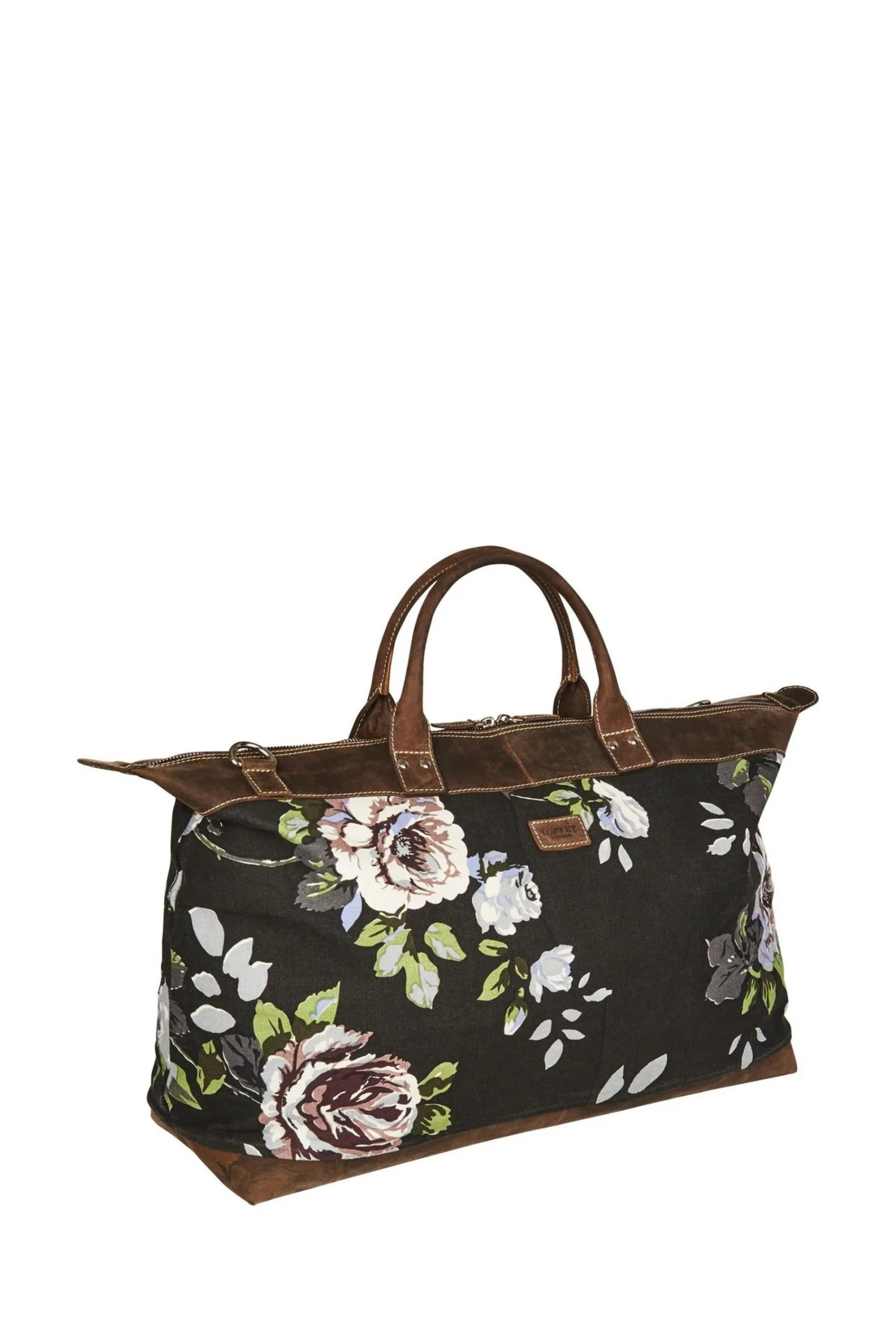 OSPREY LONDON large weekend holdall, handcrafted in Canvas printed with a modern floral with chocolate brown Snuffed Grain leather trim, sporty contrast stitching and solid metal hardware.
