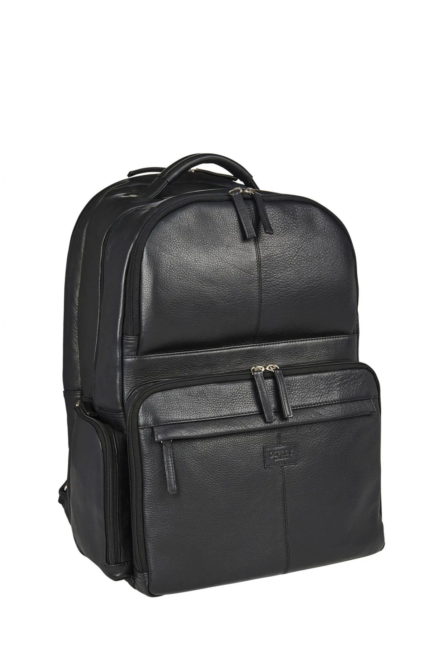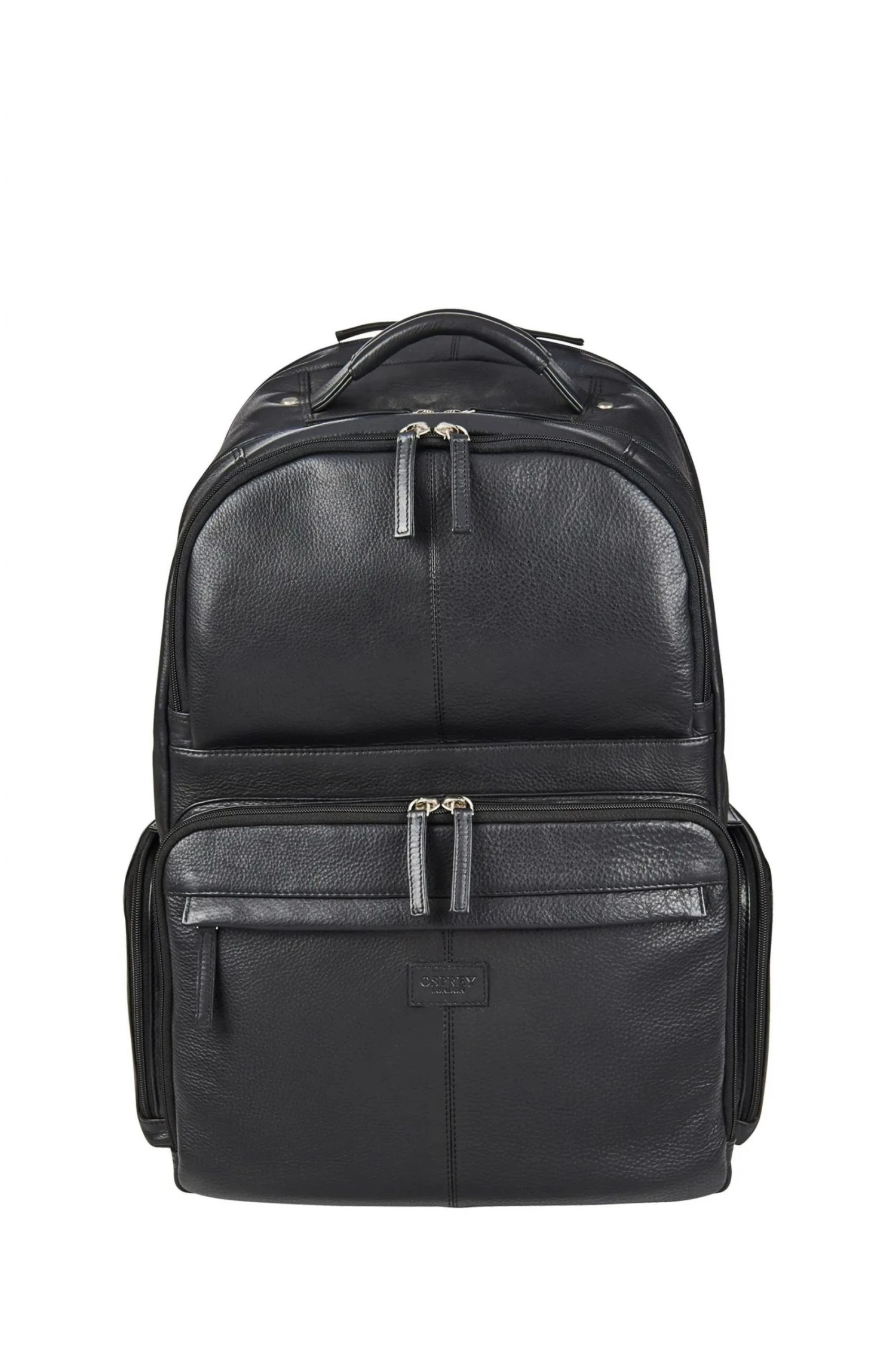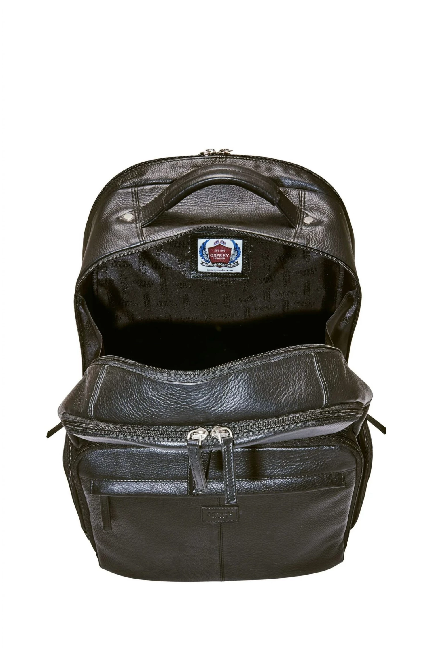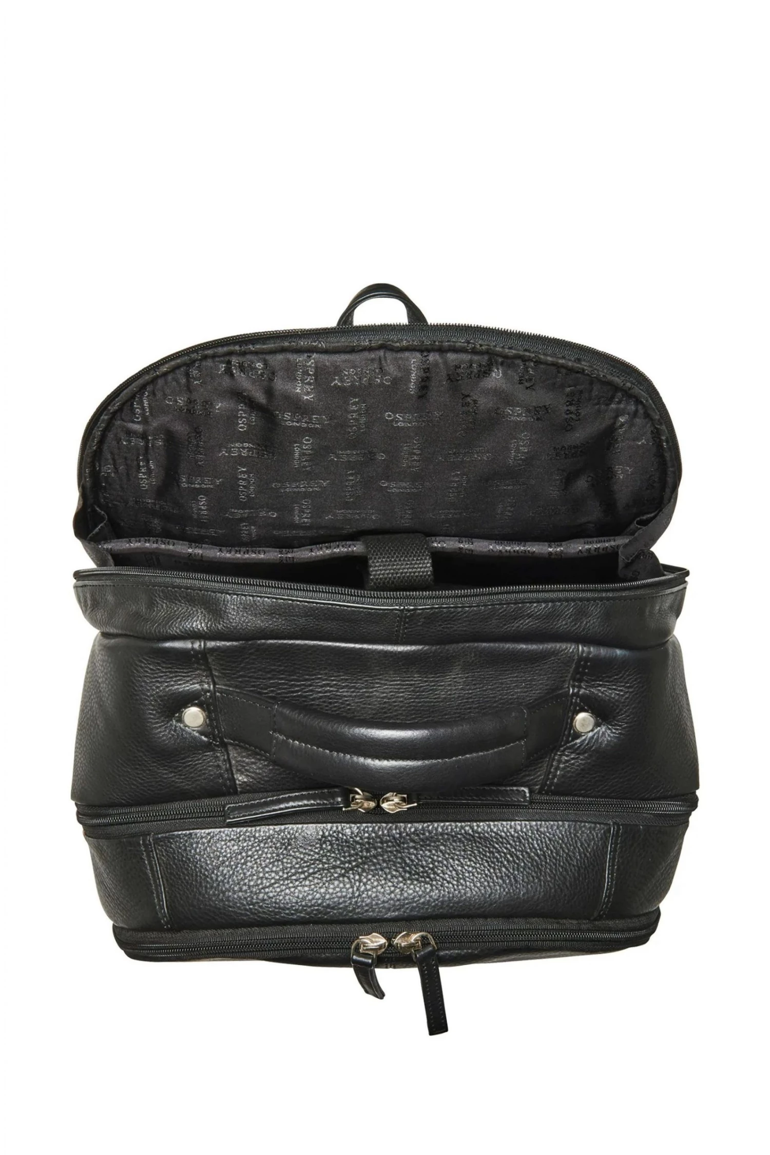 Generously proportioned OSPREY LONDON backpack with multiple separate compartments and tech friendly interior, handcrafted in supple black Grainy Hide leather and with a moisture-wicking technical fabric on the reverse.