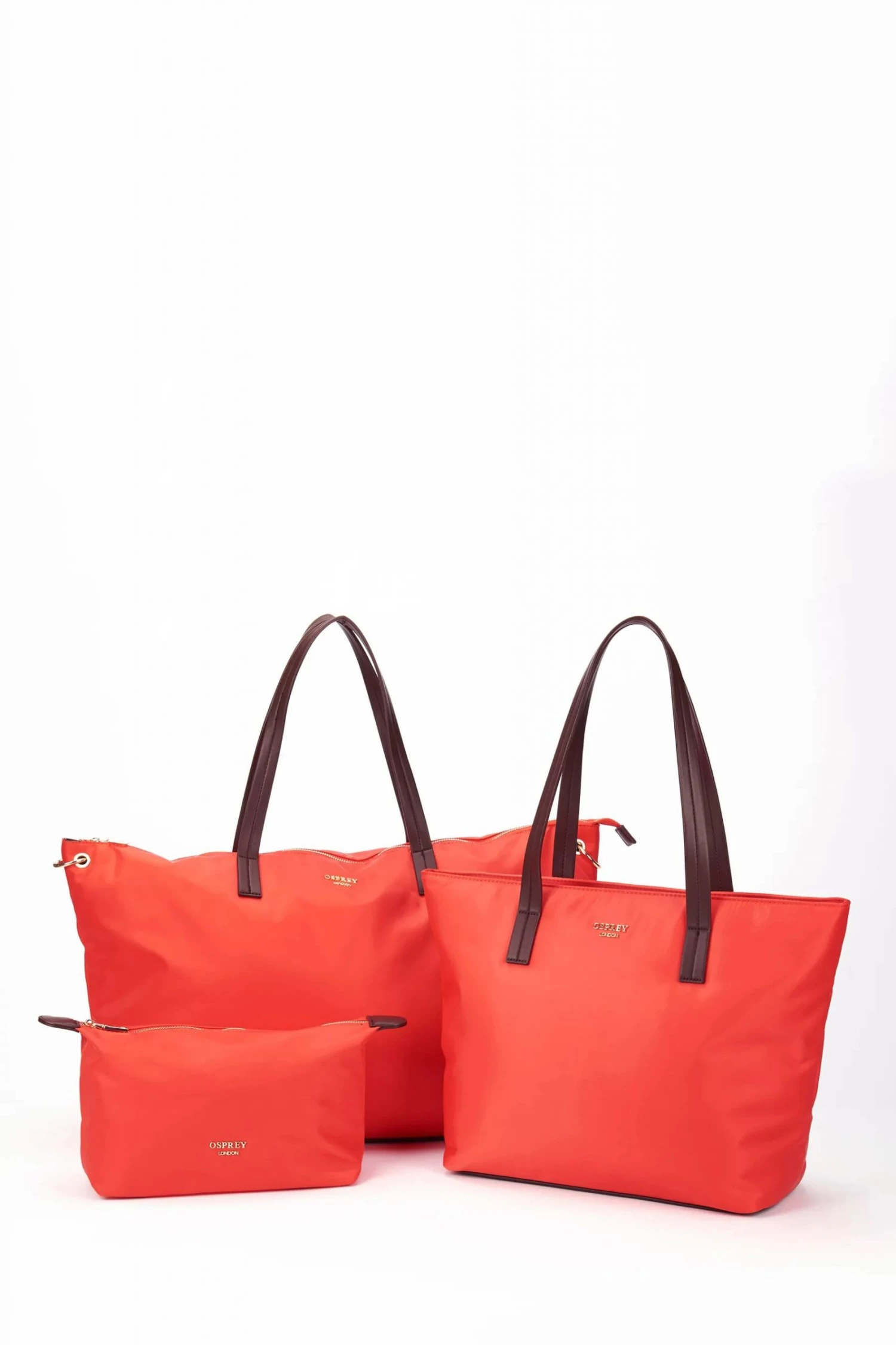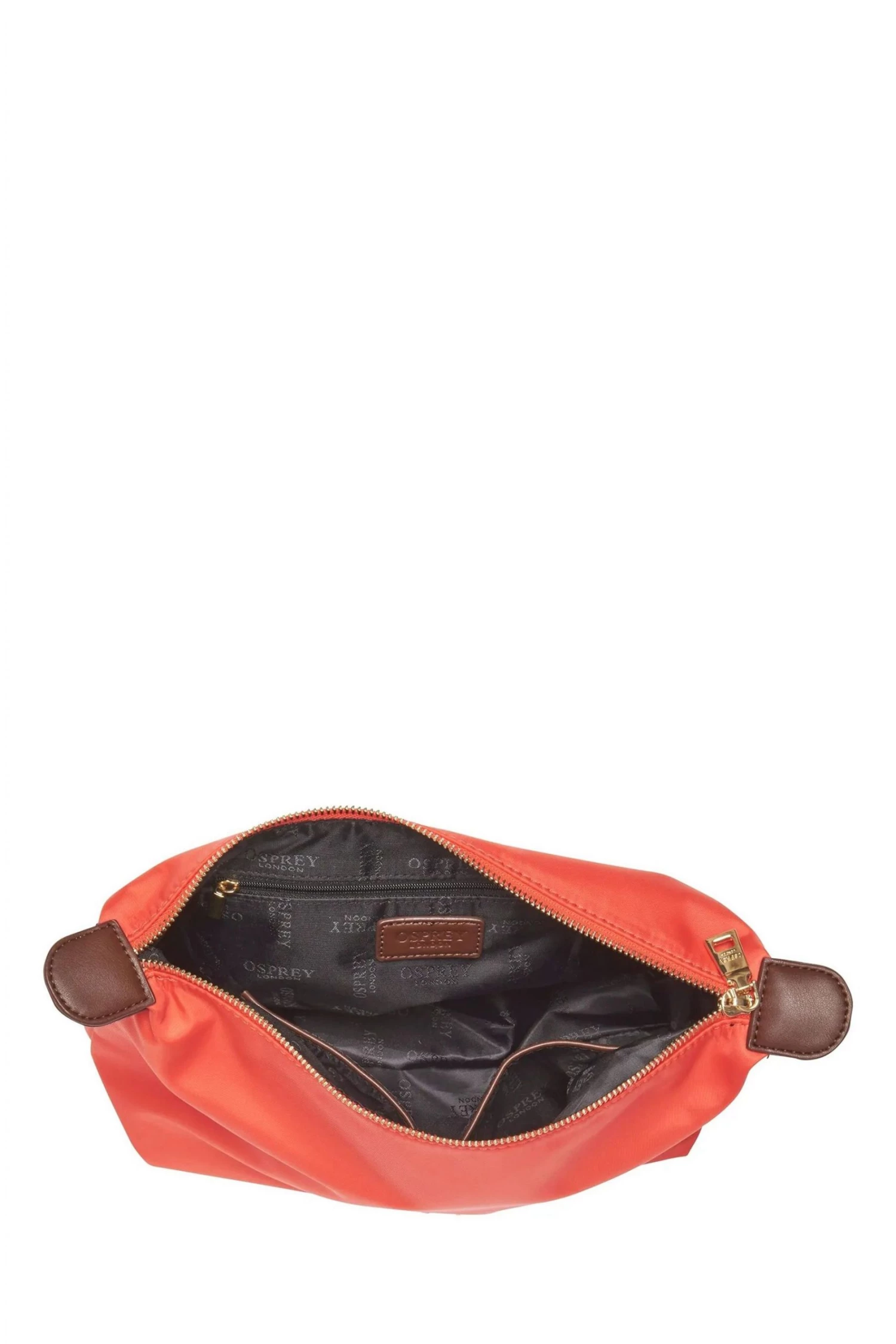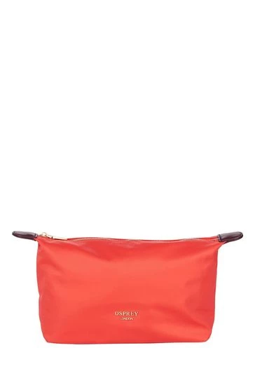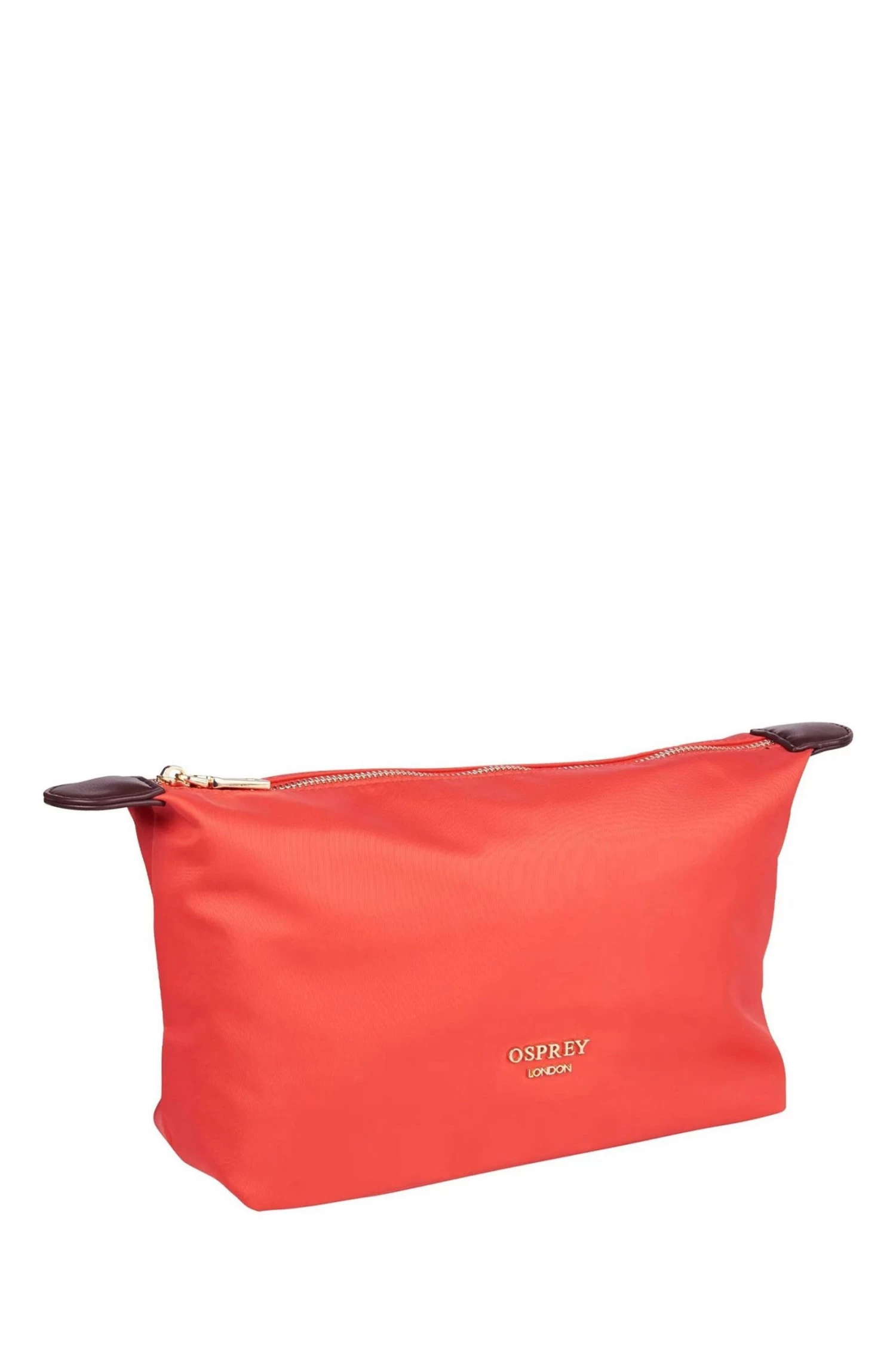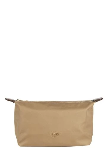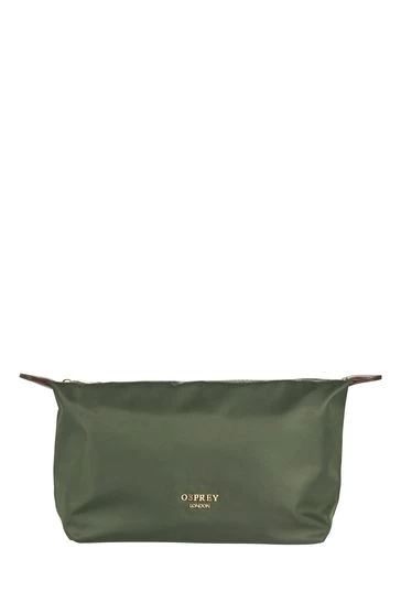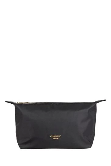 An Osprey London flat base washbag, crafted in nylon with faux leather trim, with the Osprey London logo in statement gold metal lettering on the front.