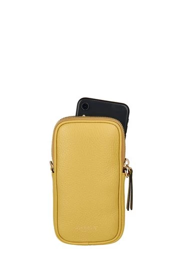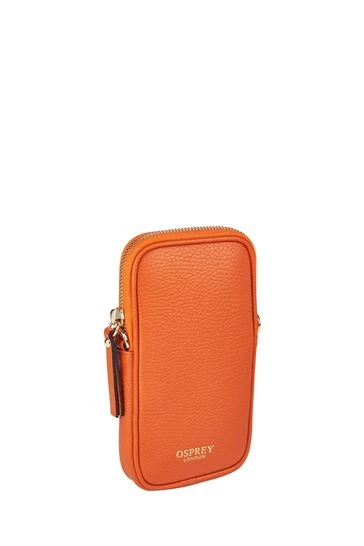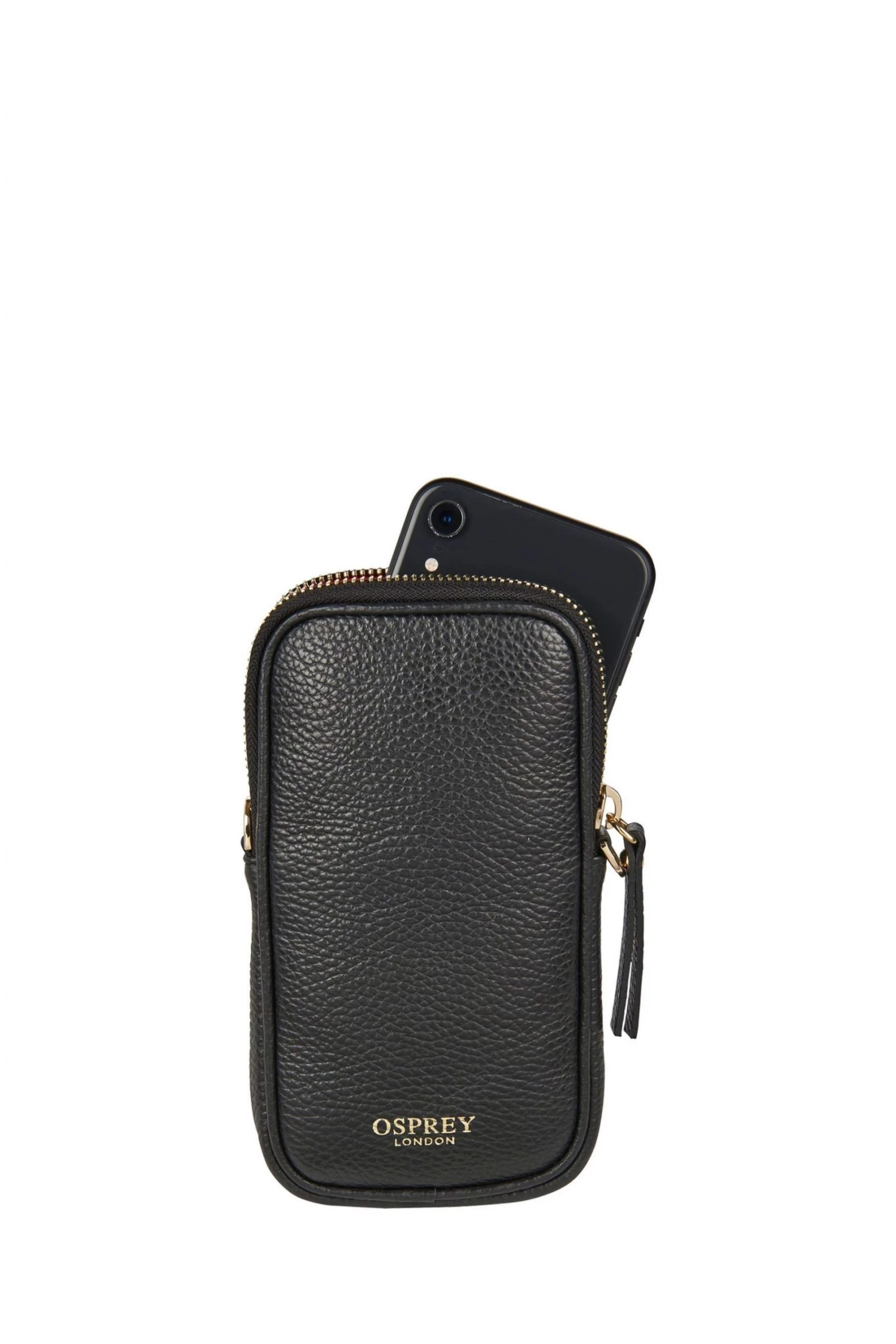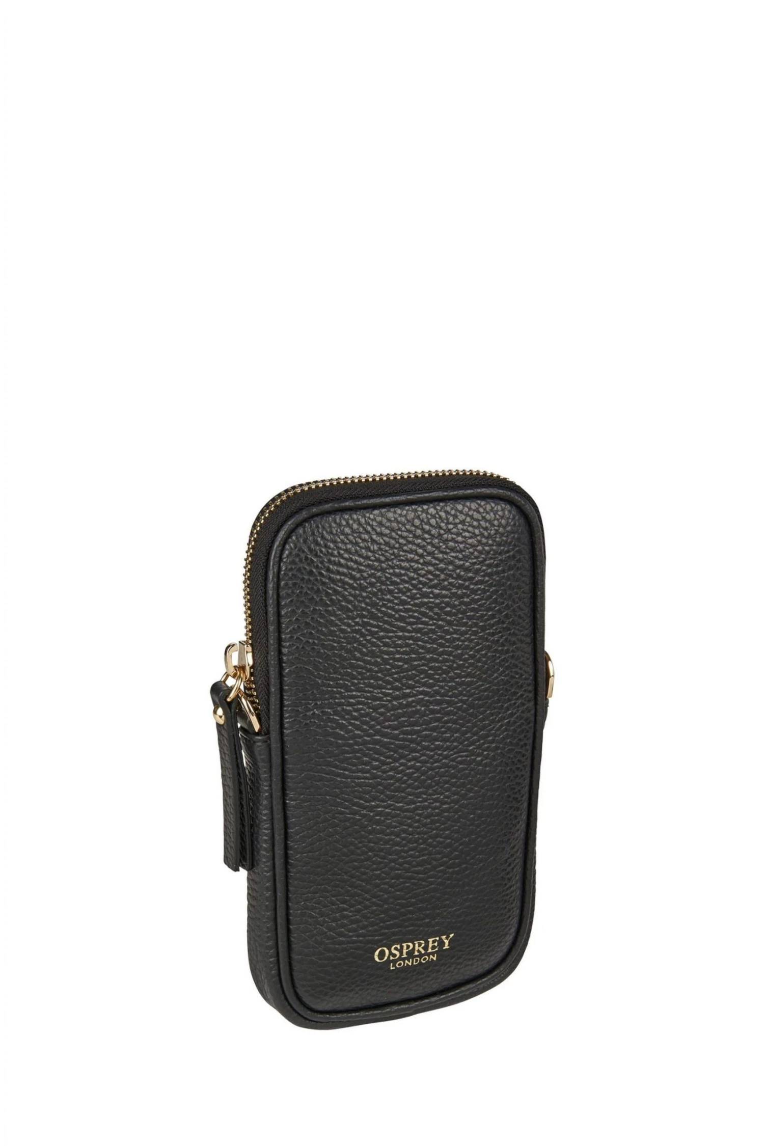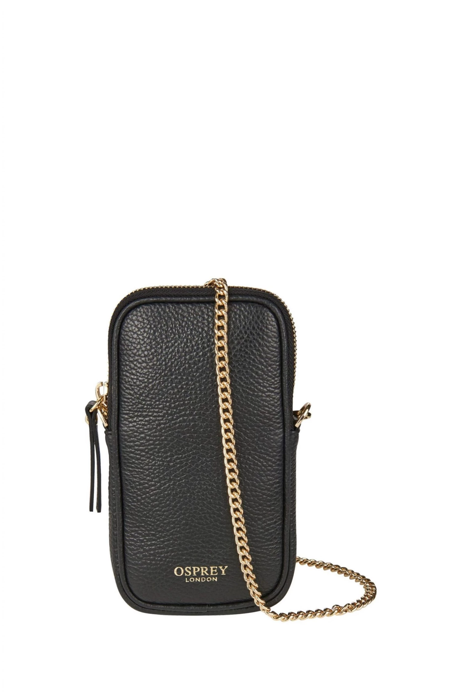 Mini OSPREY LONDON zip-round bag specifically designed to carry a mobile phone safely and stylishly, handcrafted in sumptuously soft Italian Pebble Grain leather. Will fit up to and including an iPhone 13 Max or a Samsung Galaxy S21 Ultra as a guide. Comes with a detachable gold metal chain cross-body/shoulder strap. To attach the strap, simply use the metal dog clips and fasten onto the metal D-rings on either side of the bag for versatile hands-free styling. Alternatively remove the chain and carry in a pocket or workbag. Dimensions: H: 18 x L: 10 x W: 2 cm (53.5cm strap height).