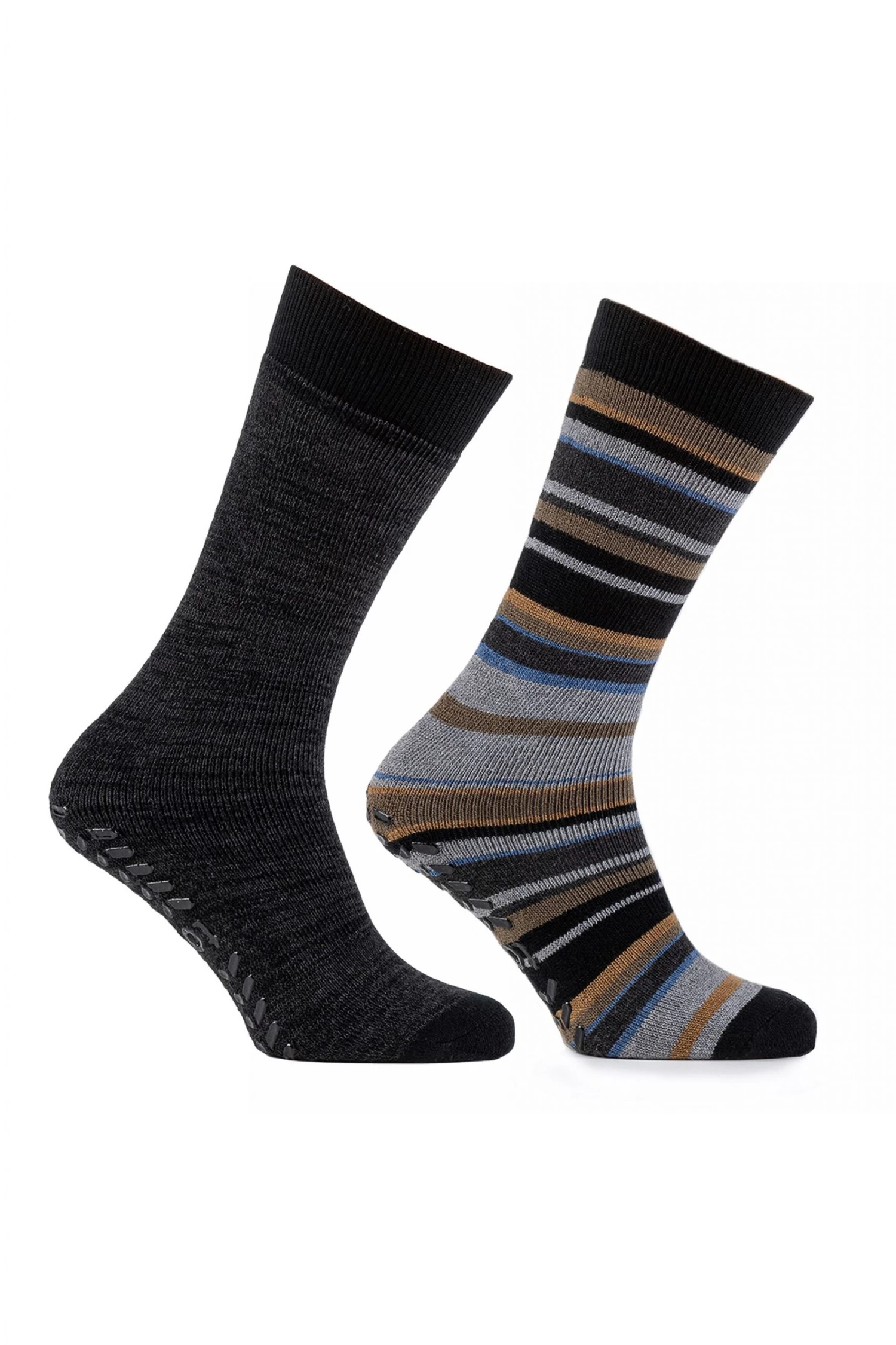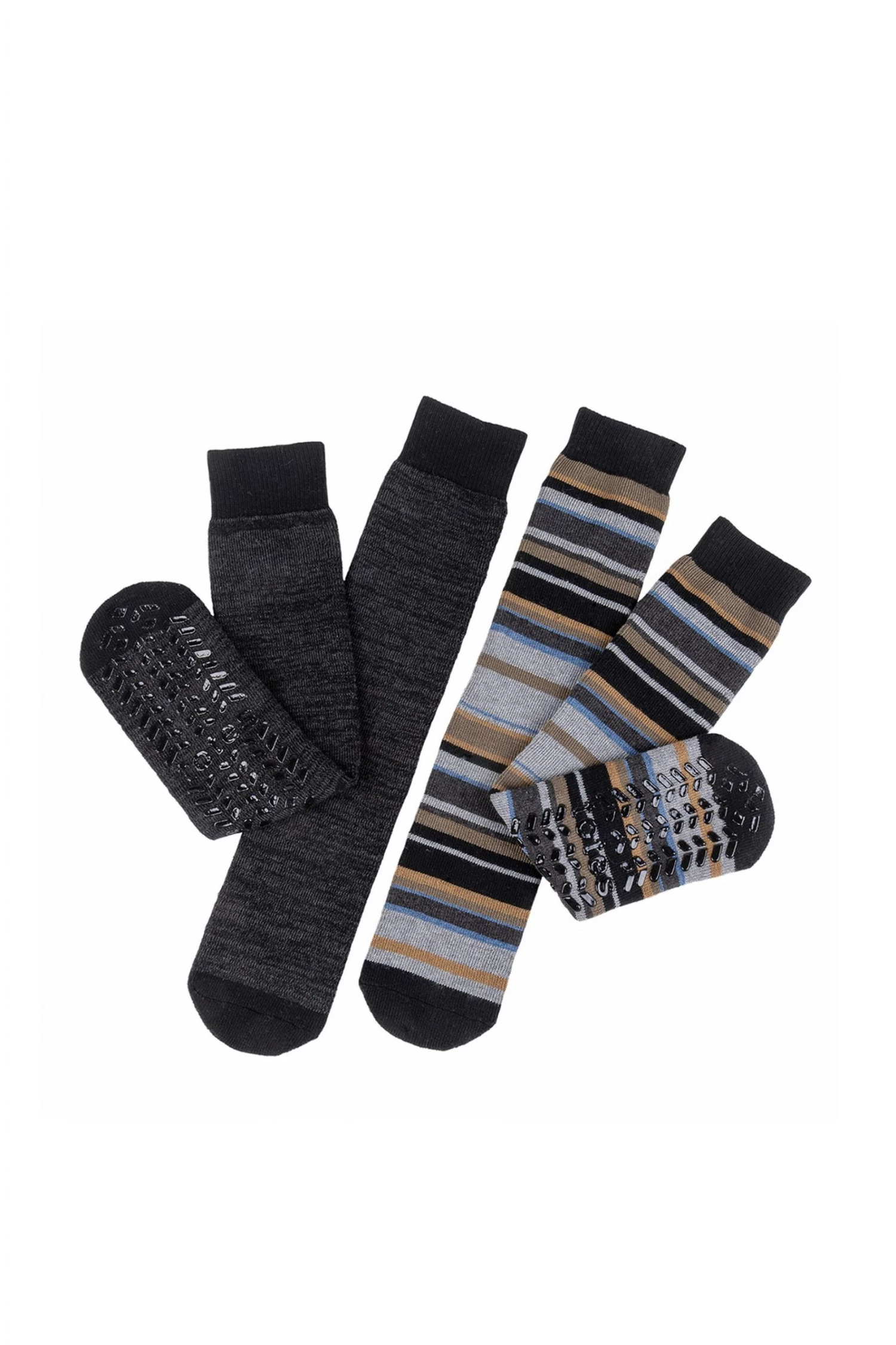 Our Mens 3 Pack Original Slipper Socks come in Novelty Designs, Slip-Resistant Tread and in One Size with a Warm Terry-Lining.