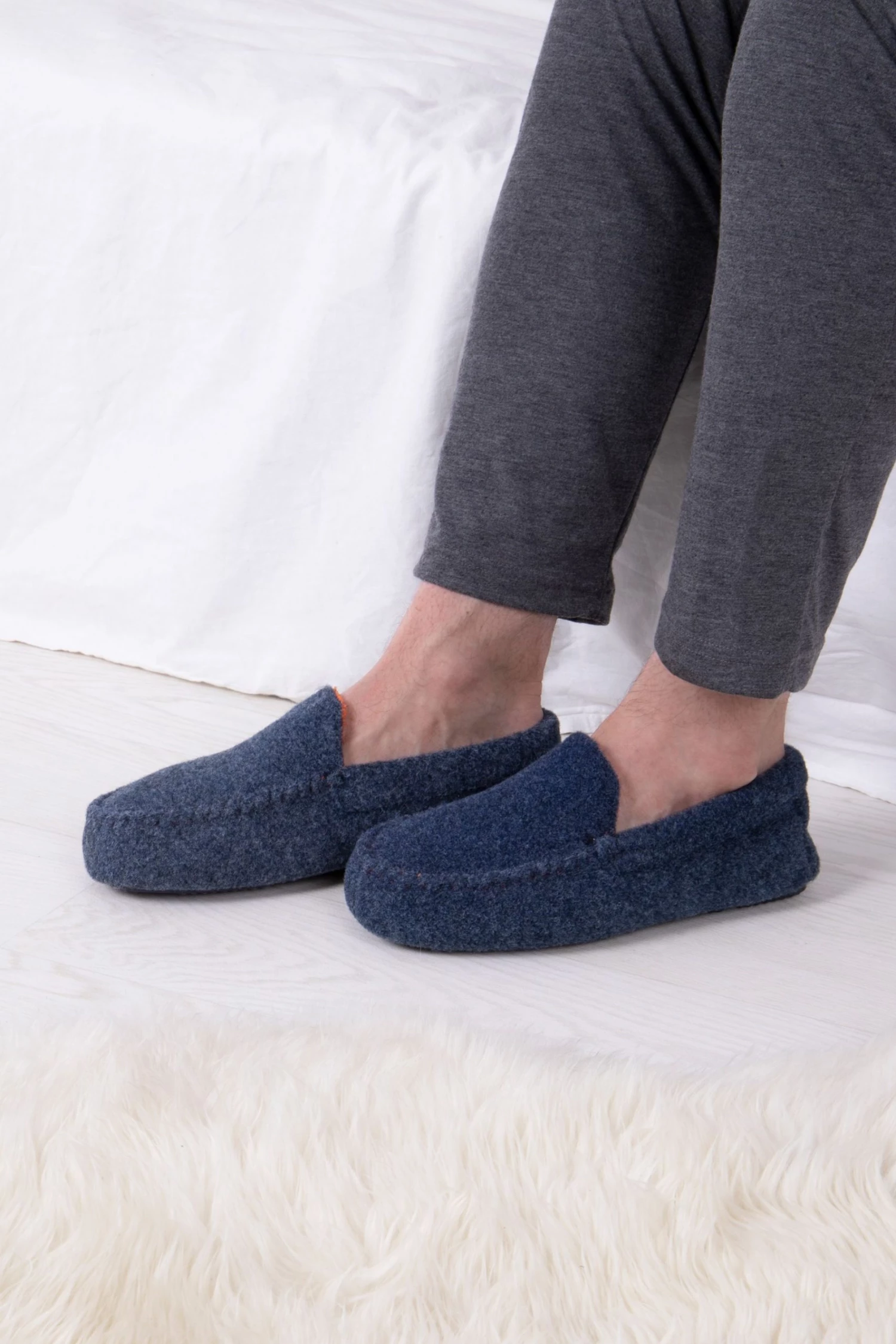 Our Felt Moccasin with Contrast Binding has a Curly Fur Lining, Memory Foam In-sole and a Durable Flexible sole and added support, makes these slippers warm and comfy, great for cold nights!