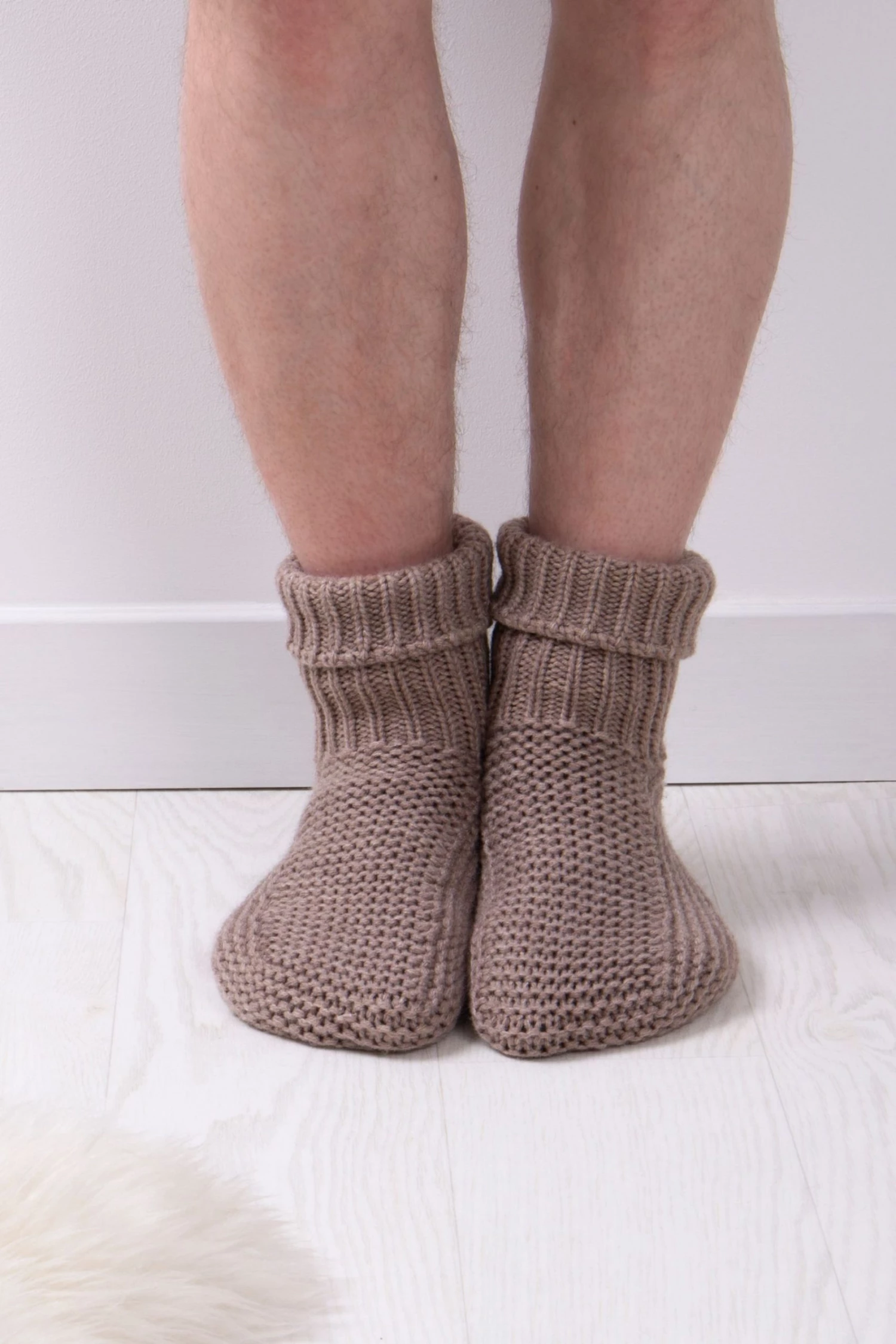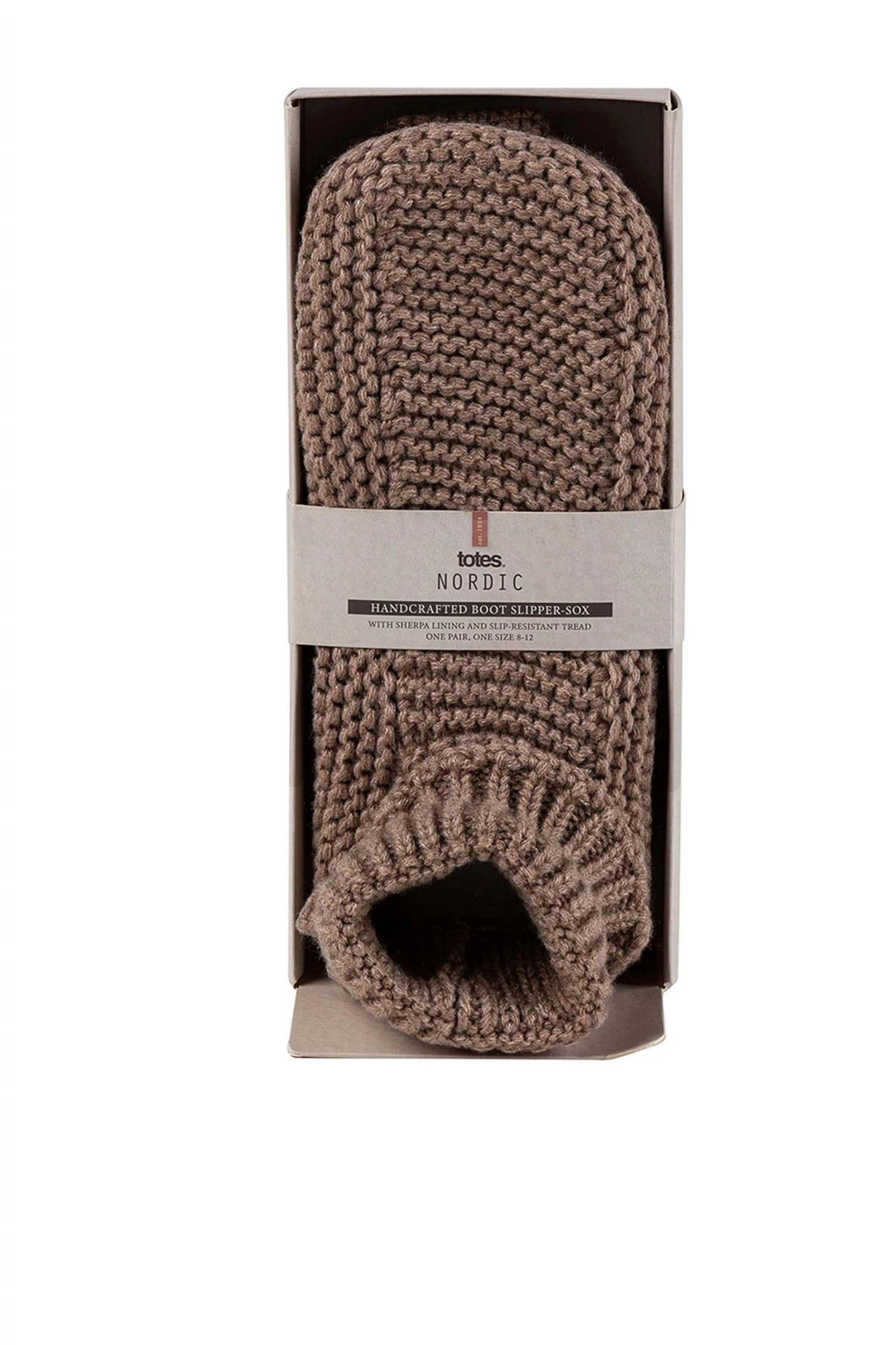 Our totes Mens Handknit Bootie Slipper-Sox feature A Slip-Resistant Tread, Rib Cuff and a Chunky Handknit Style Acrylic Knit.