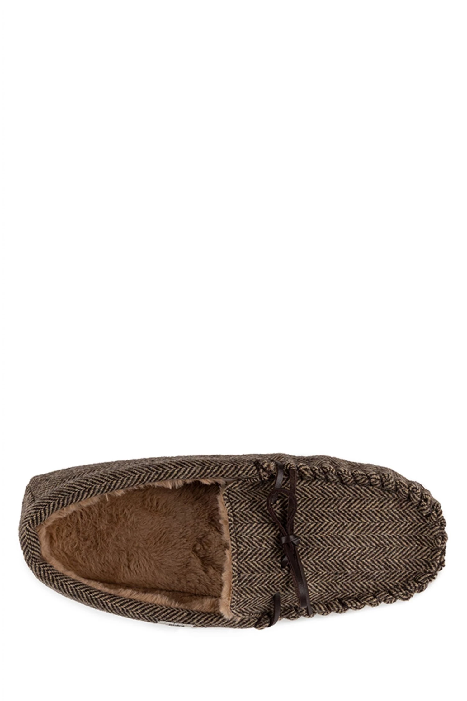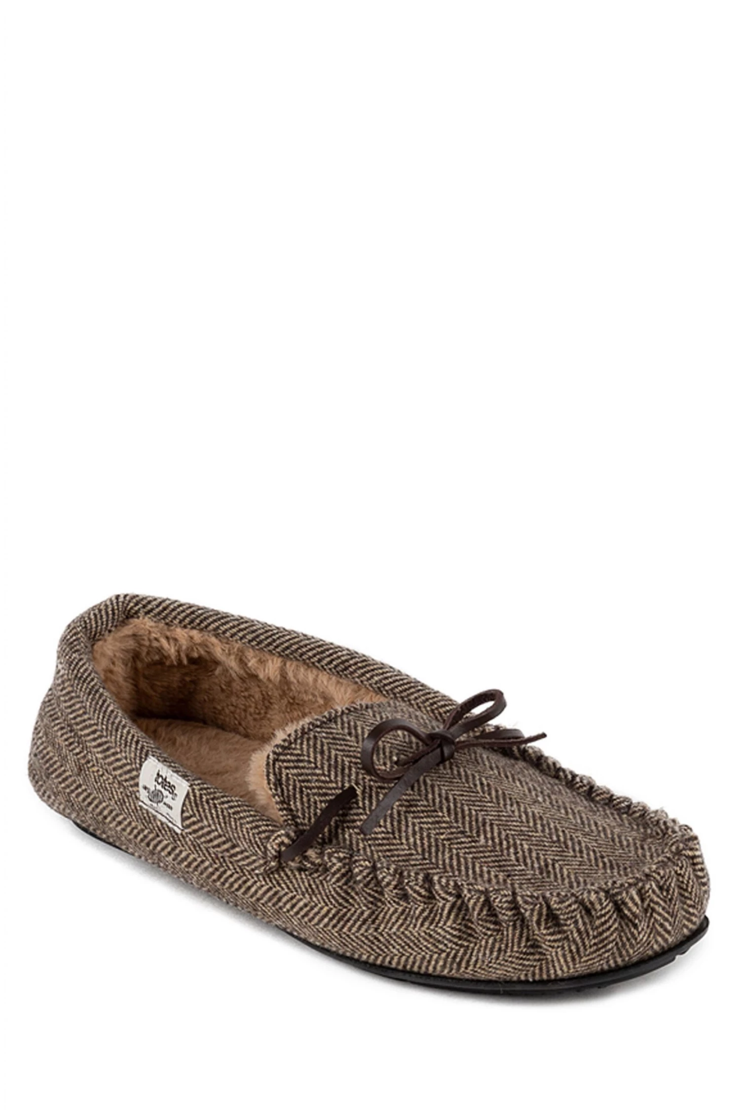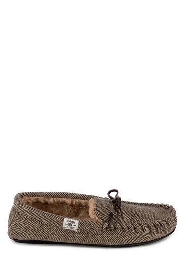 New this season, our Mens Wool Check Moccasin Slipper features Warm & Cosy Charcoal Fleece Lining, Durable sole and Suedette Bow Trim detail.