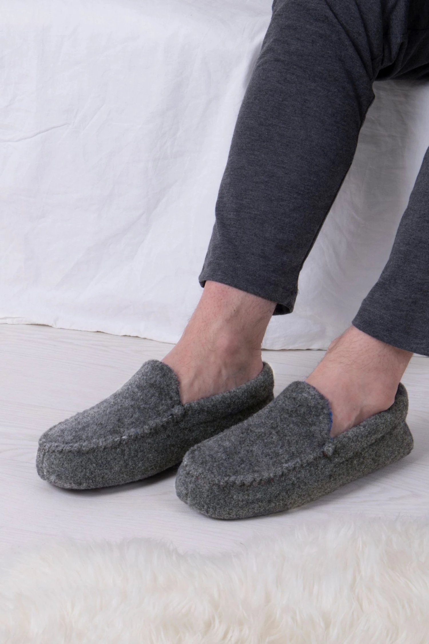 Our Felt Moccasin with Contrast Binding has a Curly Fur Lining, Memory Foam In-sole and a Durable Flexible sole and added support, makes these slippers warm and comfy, great for cold nights!