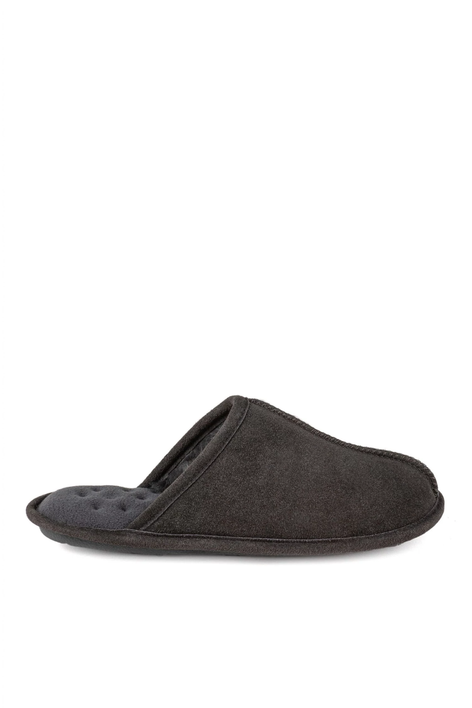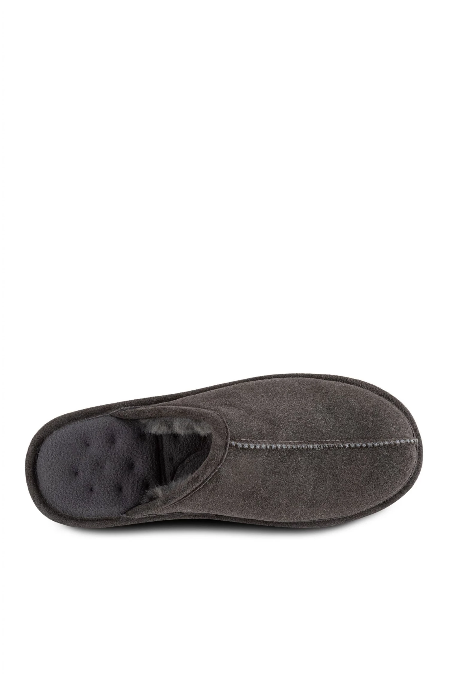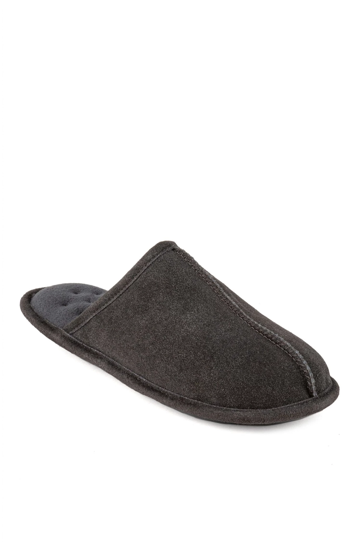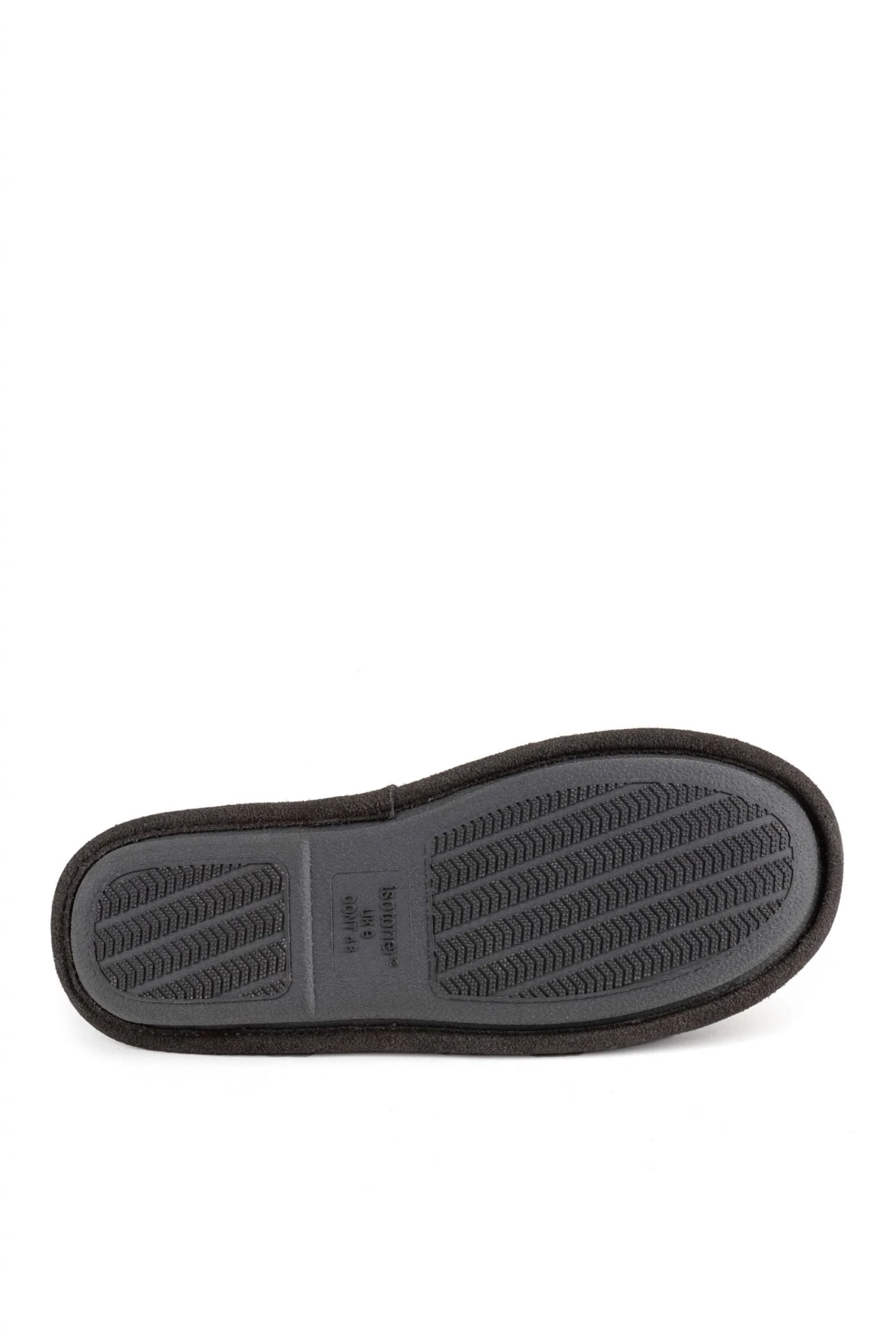 Our Isotoner Mens Real Suede Mule Slipper features our Memory Foam Cushioning, Faux Fur Lining with Suede Binding and a Durable Sole.