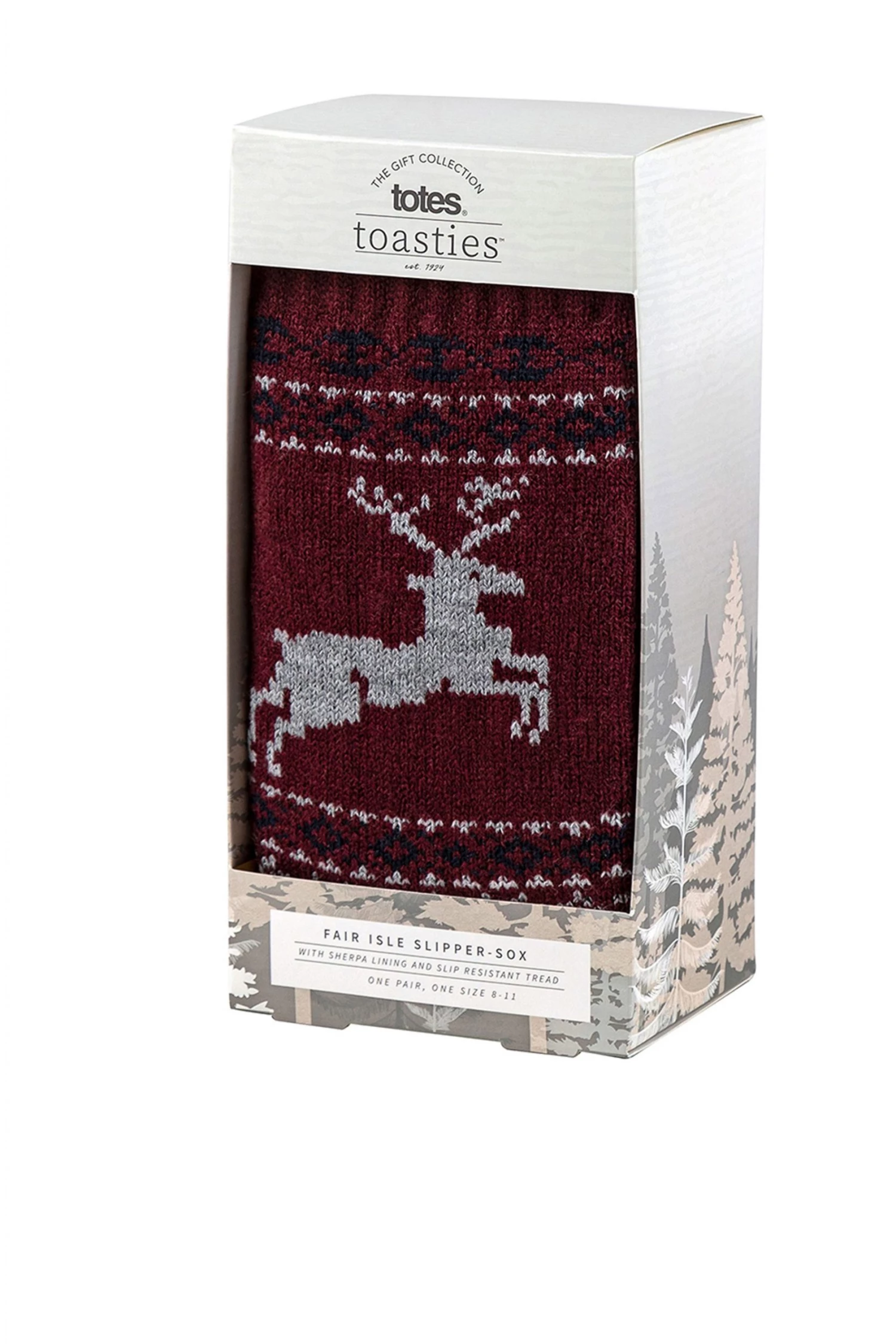 New this season, our totes Mens Fair Isle Slipper Sox feature a Warm & Cosy Sherpa Lining, Slip Resistant Tread and come already packaged. Great for a Gift for your loved ones!