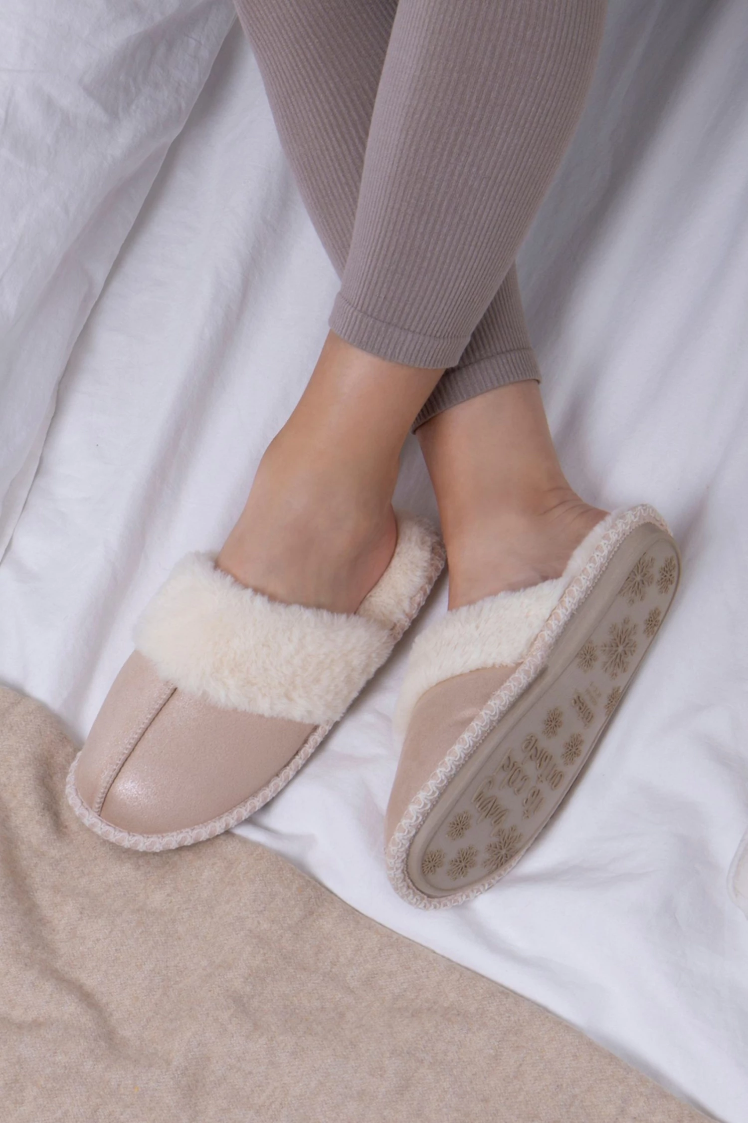 Our suedette fur mule slippers come complete with a durable sole, memory foam and secret sole for heel and arch support.